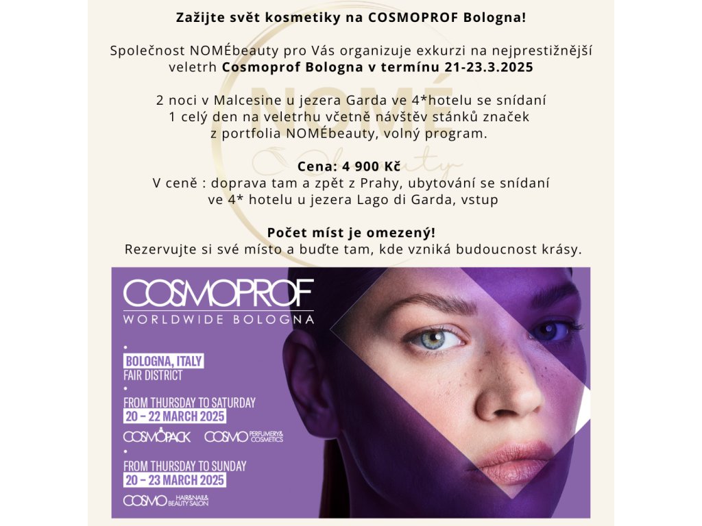 Připojte se k nám na exkluzivní cestě na nejprestižnější kosmetický veletrh Cosmoprof Worldwide Bologna, který je už více než 50 let centrem nejnovějších trendů, inovací a špičkových produktů z celého světa.