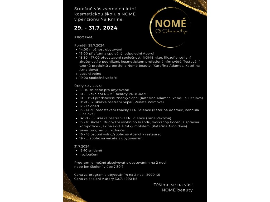První oficiální NOMÉ beauty školení už má své datum! Uskuteční se v termínu 30.- 31.7.2024 v krásném prostředí penzionu Na Kmíně v Obříství.